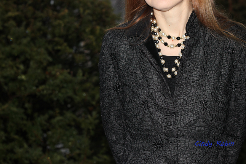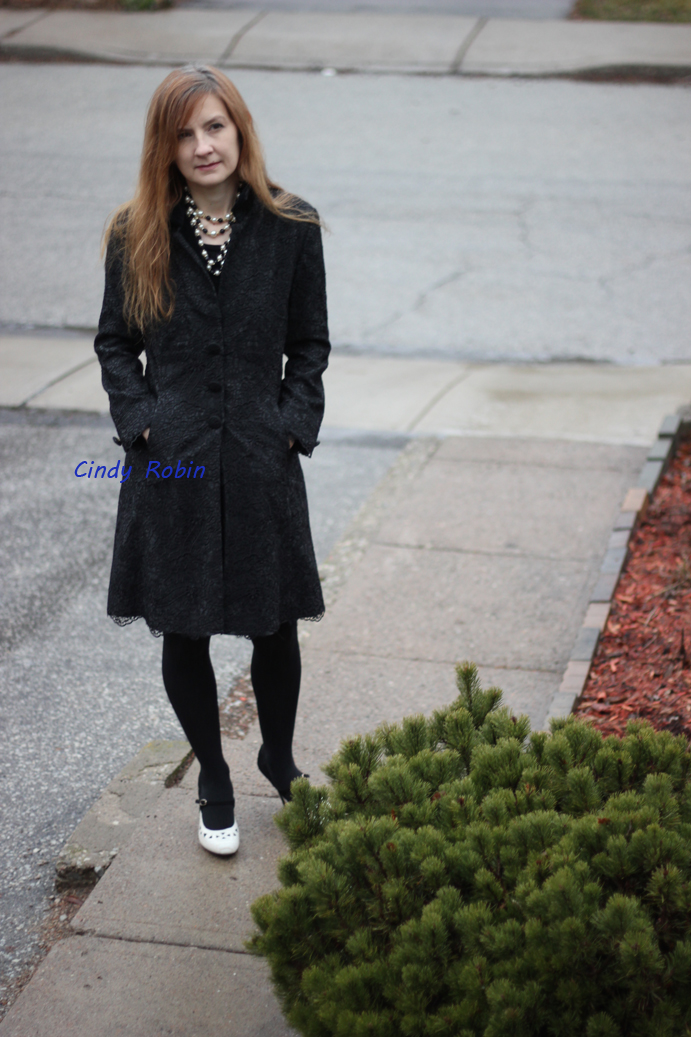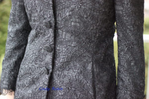 I saw a black lace trenchcoat in a fall winter 2011-2012 collection that used a motif lace. I wanted to create a similar style with a more unusual lace. This was the result. Next time, I would buy more lace to make pattern placement easier. The layout for this took some engineering.